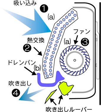 3-熱交換器によって熱交換された空気が内部ファンによって吸い込まれる 4-ファンにより取り込まれた空気は吹き出し口より吹き出しルーバーの間を通り室内へ排出される。 |