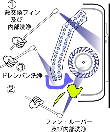 エアコンから臭いが出てきたら完全に「イエローカード」の状態です。以下のような方法でエアコンを洗浄致します。 ☆私どもは、一般的にエアコン洗浄に使用している、熱交換器あるいは清掃後の排水による環境にダメージを与える「酸」の度合いが強いものではなく。人体への影響が皆無で、薬剤自体が清掃排水後に自然のバクテリアの働きによって100%微生物分関される環境に優しい特殊洗剤を使用しています。 「注意」最近、ホームセンター等でエアコン用洗浄剤スプレーが販売されています。 このスプレーは熱交換器フィン前面は洗浄できますが、噴射される薬剤の圧力が弱く、エアコン内部あるいはフィンに薬剤を到達する事が出来ません。またドレンパンにこびり付いているヘドロを強制的に剥離、除去するだけの水量も発生しません。 その為、除去しなければ家庭内環境を悪化させる、ドレンパンにこびり付いているヘドロ、内部の固まった埃等を除去するという期待どおりの結果は得られません。 |