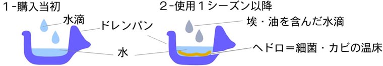 1-室内の埃、外から飛んできた花粉等あるいは、台所で料理した際に舞い上がる油とうは、図1のようにエアコン稼働中は吸い込み口から、(a)熱交換器を通る際に熱交換器(アルミ製フィン)に触れます。 また、内部でファンが回転している為に、ファン自体あるいは、内部の壁にも接触し、埃と油が付着して行きます。 2-特に冷房運転時には、暖かい室内の空気が冷却された熱交換器(アルミフィン)に接触した際に、空気中の水分が「水滴化」します。この水滴は熱交換器(アルミフィン)下部に設置された水分を集積し排出する溝に集まります(b)。この溝はドレンパンと呼ばれます。 3-購入当初は熱交換器にまだ埃・油等が付着していない為、図2のようによごれていない水分だけが落下してきて、そのまま室外に排出されます。 これが冷房運転時に室外機付近に出てくる水の正体です。しかし、夏・冷房運転し、その後、冬に暖房運転、梅雨時期にドライ運転等を行います。 当然、熱交換器、ファン、ドレンパンには、埃・油等が付着してきます。 4-設置後1年経過後に、冷房運転を行うと2-2でご説明したように、熱交換器で水滴が発生し、付着した埃・油を含んだ汚れた水分がドレンパンに落下してくるようになります。 この埃・油等は全て室外に排出される事はなく、ドレンパンの底部分に「ヘドロ」として残留してきます。 このヘドロは常に湿った状態です。 その為、細菌あるいはカビ等の温床となり、毎年ヘドロ自体の厚みを増して行きます。 |