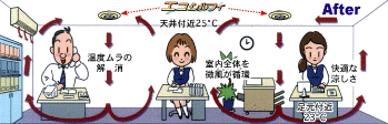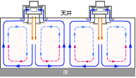 「強制対流」が、 システムのポイント 稼働させると、室内の どのポイントでも、同程度の 温度に落ち着き 空調機の設定温度が低めでも 良い環境を得られます。
