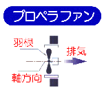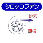 スプーン状の羽根が円筒状の外側に設置されていおり、空気を押し出す(遠心式)方式です。風量はプロペラファンに比べるとやや低いのですが、ダクトなどの抵抗があっても静圧(空気を送り出す力)は低下せず、強力に排気します。 |